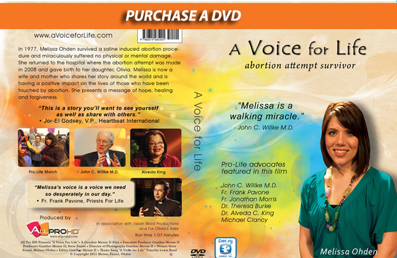 When you purchase a personal DVD copy of Melissa Ohden's Story “A Voice for Life” we mail your product immediately. Local sales tax and $3.50 shipping apply.